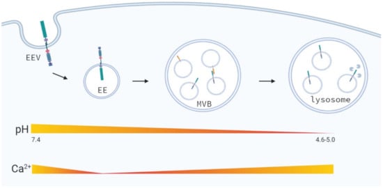 Changes in the ion-concentrations during intracellular trafficking. The vesicular pH decreases upon endocytic trafficking due to import of H+-ions leading to gradient acidification. Ca2+-ion concentrations initially decrease during early endosomal trafficking and gradually increase during late endosomal trafficking reaching the highest Ca2+-ion concentration in the lysosomes. Adjusted from Scott and Gruenberg [].