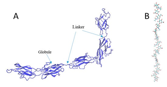 At first, the LP and CP were docked, then the LP–CP protein complex was further anchored with TR to get the final protein complex (LP, CP, and TR) of the PNN. Finally, a hyaluronic acid chain was attached to an LP by a glycosidic covalent bond using the CHARMM-GUI Glycan Reader and Modeler module [36]. The HA chain consisted of 15 repeated dimers of β-N-Acetylglucosamine (GlcNAc) and β-D-glucuronic acid (GlcA) linked via alternating β-(1→4) and β-(1→3) glycosidic bonds [37]. The PNN unit is shown in Figure 1B; it represents the inset portion of Figure 1A.