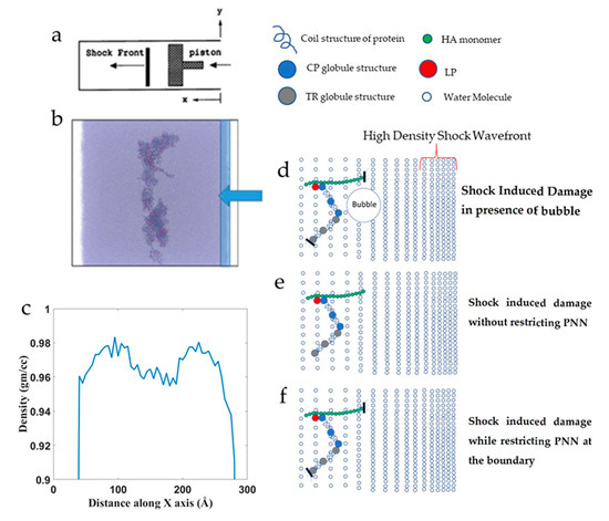 The simulation box for shock propagation. (a) Schematic illustration of the shock simulation setup. (b) Snapshot of the shock simulation box by the OVITO visualization tool. (c) Density profile along the shock direction. (d–f) Schematic illustration of the simulation protocol (d) while restricting the PNN in the presence of bubble, (e) without restricting the PNN, and (f) with restriction.