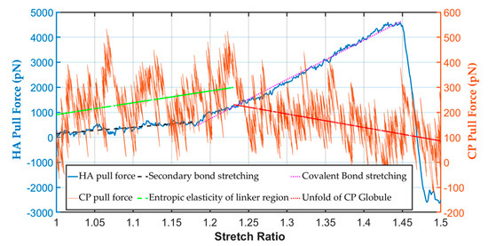In, the CP was stretched to 50% of its initial length, and the maximum pulling force was only 400 pN. The maximum pull force for protein tertiary structure unfolding was in a range similar to that found experimentally using the AFM technique (500 pN) [49]. It was observed that the unfolding force varied in a sawtooth pattern with respect to the stretch ratio. Upon stretching, the force gradually increased owing to the entropic elasticity of the unstructured linker region between two globules (Figure 5). After that, as the tensile force rose, one of the globular domains could not resist the force and started to unfold. In our study, we saw such a pattern during the stretching of the protein. We found in this simulation that the linker regions elongated at 0 to 25% stretch from the unfolding observation. After that, an unfolding of the weakest globule started (at 25 to 50% stretch). The simulation data fluctuated significantly for the pull force of the CP; therefore, to find the trend of different regions, we fitted the data by linear curve fit. The maximum stretching force of the linker region from the fitted result was 300 pN, also within the experimental value.
