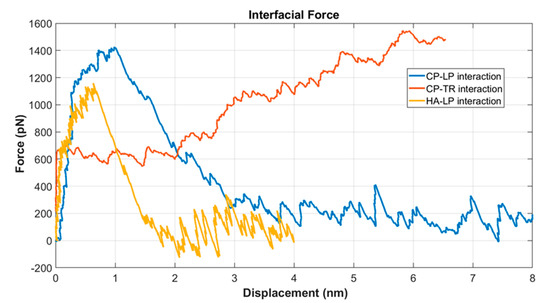 In the PNN network, three different interfaces existed: CP–LP, LP–HA, and CP–TR. Interfacial strength played a significant role in the mechanics of the PNN under shock wave. LP, HA, and TR from the three interfaces were pulled, whereas the other molecules (CP, LP, and CP) of the pairs were kept fixed at their initial positions. The CP > TR > LP > HA mass for the PNN model, although in reality, the molecular mass of HA was maximum because of its very long chain. Figure 6 shows the relative interfacial strength of the three different interfaces. It was found that HA–LP had the lowest strength and CP–TR the highest. The CP–TR bonds never failed during the simulation. Instead, the TR molecules unfolded. The interfacial strength for the pair of molecules considered was between 1100 and 1500 pN. This strength was well below the fracture strength of the covalent bond. The LP–HA interface failed at around 1100 pN force, whereas the LP–CP failed at 1400 pN force. The CP–TR did not fail during the simulation period.