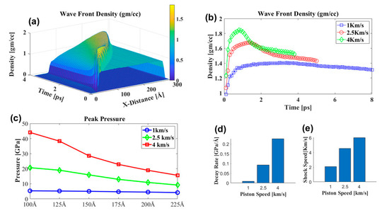 In this work, a piston was used to initiate the shock. The piston was moved up to 30 Å from the positive x-axis at 1, 2.5, and 4 km/s speed to create different shock speeds. Figure 7e shows the corresponding shock velocity at different piston speeds.