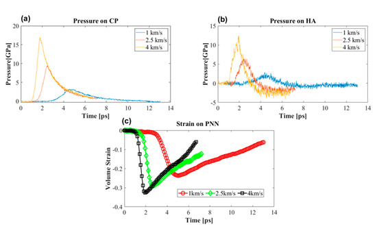 While the shock propagated, different molecules experienced different levels of pressure. Figure 8a,b shows the pressure profile in the CP and HA. These two molecules were considered because other molecules are proteins. They were representative of the structural and bonding conformation of the CP molecule. Therefore, it was reasonable to assume that the LP and TR would experience pressure similar to what the CP experienced. Peak overpressure depended on the shock speed; as the shock propagated the CP experienced 17, 9, and 3.5 GPa compressive stress, while HA experienced 12.5, 6, and 2 GPa at 4, 2.5, and 1 km/s piston speeds. With this compressive stress the PNN experienced a maximum of 35% compressive volumetric strain at 4 km/s (Figure 8c).