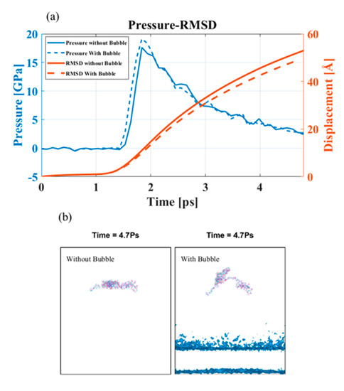 In this case, the peak pressure was much higher than 2.2 GPa; it was reasonable to assume that the bubble would collapse asymmetrically. The bubble’s asymmetric collapse formed a water jet that reached farther away from the cavitation epicenter and caused more damage. We investigated the pressure profile of the PNN components in the presence of a bubble of 8 nm diameter and found an insignificant change in overpressure (Figure 9). However, the overpressure on the CP molecule bubble-projected zone was higher than that without the bubble model for 4 km/s piston speed (Figure 9a). However, it was interesting to note that although there was a differential overpressure at the projected area, the RMSD of the PNN was lower with a bubble at the same shock speed. A water jet formed during the bubble collapse mainly damaged the local region of the PNN. The portion of the CP molecule on the bubble-projected zone is shown in Figure 9b. The damage intensity can be very high, so the protein molecule’s primary structure was also susceptible to this damage. The model’s difference in deformation behavior with and without a bubble clearly showed that high water jet velocity can break any bond encountered (Figure 9).