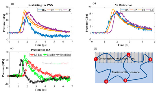 Covalent and non-covalent bonds interlinked the PNN components (electrostatic and van der Waals bonding). There will be a difference in the acceleration profiles of the components. Therefore, it was reasonable to assume that one part of the molecule may experience 15 GPa while other parts are still at atmospheric pressure. The links are often considered rigid as compared to the molecule itself. We observed that only the HA molecule experienced negative tensile stress owing to fixing one end. Although two atoms at the two ends of TR were fixed, its average pressure did not change significantly (Figure 10a,b). HA mostly experienced tensile stress from its chain conformation. The globular structure of the proteins unfolded upon loading by breaking the non-covalent bonds. We found that the fixed end of HA experienced higher tensile pressure than the middle portion and the part connected to the LP (Figure 10c). HA was the backbone of the PNN. Therefore, it was essential to analyze its deformation behavior during shock propagation. We assumed the PNN to be an interconnected polymer network model similar to the schematic in Figure 10d. In an actual PNN, the CP and TR are responsible for the mechanical integrity of the network, and HA forms the backbone of the network. The previous study showed that a mere shock wave does not provide the necessary tensile force to damage the HA [18]. Instead, the presence of a bubble interacts with a shock wave, causing damage to the HA by the water jet. We argue that the actual ECM is a connected network structure (Figure 10d), bonded at the nodes (indicated as a red dot in Figure 10d). While some portion of the long HA chain was located in the compression zone during shock propagation, the other part was found in the tensile pressure zone of the model. The differential pressure and velocity profile of the atoms in each location caused a tensile pressure to the long-chain HA molecule. Nodes 1, 2, and 3 (Figure 10d) were located in the compression zone, whereas the Nodes 4 and 5 were located in the tensile zone. Shock propagated in the medium predominantly by the water molecules. If we applied the momentum balance equation, the net velocity of the water molecules would be much higher than that of the other biomolecules in the model [56]. We know that shock is a longitudinal pressure wave, while it propagates in heterogeneous media like ECM, the differential velocity of the water and biomolecules creates a tensile force to the long molecular chains. The shock wave passed through Nodes 1, 2, and 3 at 5 km/s wave speed, but Nodes 4 and 5 of the rarefaction zone remained at a lower velocity. This differential wave speed caused a tensile force to the connected molecule (the molecule between Nodes 2, 5; Nodes 1, 4; and Nodes 3, 5). We observed this phenomenon in our simulation. We restricted the HA molecules in one end to represent a bonded connection between the HA-producing enzyme hyaluronan synthases (HAS). While the shock wave propagated and hit the HA–LP junction, the restricted zone remained at a standstill, and the velocity difference caused a tensile strength to the molecule. The tensile pressure was sufficient to break the molecule (Figure 10c). Pressure at the LP–HA junction was compressive, whereas it was tensile near the fixed end of HA.