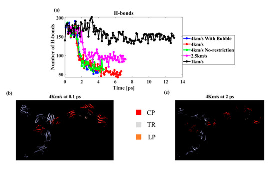(a) Number of hydrogen bonds at different speeds and boundary conditions (cut-off distance 3 Å and angle 20°), (b) Beta-sheet at the initial undeformed state, and (c) beta-sheet in the deformed state due to the shock wave.