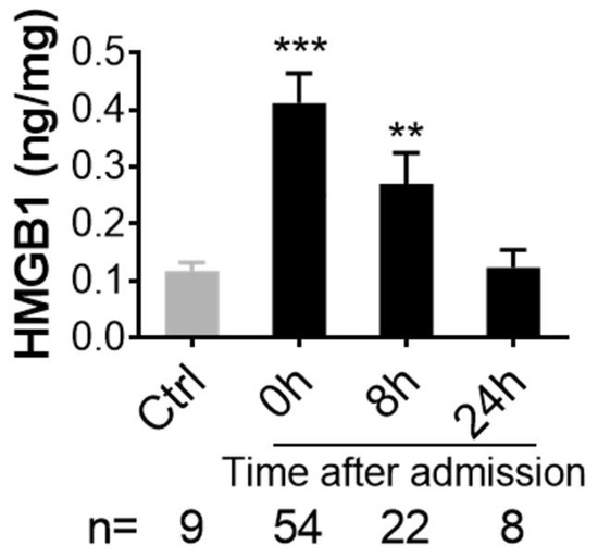 HMGB1 is significantly elevated after injury in trauma patients. Blood plasma from 54 casualties (on admission 8 and 24 h after admission to a hospital) and 9 civilian volunteers (Control, “Healthy”) was used for analysis. High mobility group box protein 1 (HMGB1), an inflammatory factor, was measured by ELISA. The data are expressed as nanograms per milligram total plasma proteins and presented as mean ± SEM, ** = p < 0.01, *** = p < 0.001 vs. Control (Ctrl).