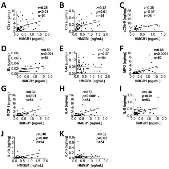 HMGB1 correlated with inflammatory mediators in trauma patients on admission. Correlations between plasma concentrations of HMGB1 in the casualties and C3a (A), C5a (B), sC5b-9 (C), Bb (D), C4d (E), MPO (F), MCP-1 (G), IL-6 (H), IL-8 (I), IL-10 (J), and IL-13 (K) in the blood plasma of the patients on admission are shown. Correlation analyses were performed by using Spearman’s rank correlation, and the data are presented with coefficient (rs) and p-values. Significant correlations (p < 0.05) are indicated by boldface type.