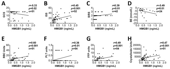 HMGB1 blood plasma concentrations correlated with clinical outcomes in trauma patients on admission. Positive correlations of HMGB1 blood plasma levels with ISS (B), SIRS (C), units of RBCs (E), units of platelets (F), units of fresh frozen plasma (G), and infused fluid (H) are shown. Negative correlations of HMGB1 plasma levels with GCS (A), and BE/BD (D) were observed. Correlation analyses were performed by using Spearman’s rank correlation, and the data are presented with coefficient (rs) and p-values. Significant correlations (p < 0.05) are indicated by boldface type.