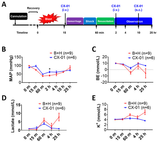 Effects of CX-01 treatment on MAP, and blood chemistry changes in the rat model of TH. (A) Experimental design. Experimental groups: (1) B + H = blast overpressure + hemorrhagic shock; (2) CX-01-treated injured rats. As marked in (B) changes of MAP were monitored via the carotid artery by the BIOPAC system and the changes were recorded throughout the study. During shock and resuscitation period, the MAP was recorded every 5 min; (C) BE/BD; (D) lactate; and (E) potassium plasma concentrations are given. Data are presented as mean ± SEM. The individual time points were compared using the unpaired t-test with Welch’s correction, and comparison of the groups was performed by two-way ANOVA. * = p < 0.05 Labels: MAP = mean arterial pressure; BE/BD = base excess/base deficit; K+ = ionized potassium.