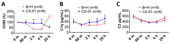 Effects of CX-01 treatment on complement hemolytic activity and complement consumption in the rat model of TH. (A) The hemolytic activity (CH50) of sera was measured, and the CH50 at each time point was normalized to the baseline level, which was pre-blast injury and the percentages of normalization are shown; (B) C1q blood serum concentrations; and (C) C3 blood serum concentrations. Data are presented as mean ± SEM. The individual time points were compared using the unpaired t-test with Welch’s correction, and comparison of the groups was performed by two-way ANOVA. * = p < 0.05 Labels: B + H = blast + hemorrhagic shock; CX-01—treated injured rats (more details in Figure 4A).