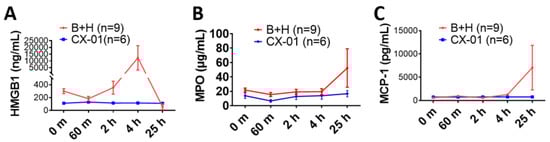 Effects of CX-01 treatment on cytokine concentrations in the rat model of TH. (A) HMGB1 plasma concentrations; (B) MPO plasma concentrations; and (C) MCP-1 plasma concentrations. Data are presented as mean ±SEM. Data were compared by using unpaired t-test with Welch’s correction, and comparison of the groups was performed two-way ANOVA. Labels: B + H = blast + hemorrhagic shock; CX-01—treated injured rats (more details in Figure 4A).