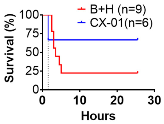 Effect of CX-01 treatment on injury survival in the rat model. Animal survival was monitored up to 24 h after TH. Survival distribution of these two groups was assessed by the log-rank Mantel-Cox test (p = 0.24).