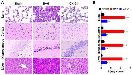 Effect of CX-01 treatment on histological changes in rats after TH. (A, B): Representative H&E photomicrographs of organs harvested at the time of necropsy (A) and organ injury were scored based on the criteria described in the Section 2 (B). The data are presented as mean ± SEM; * = p < 0.05 CX-01 vs. B + H; † = p < 0.05, Control vs. B + H (using the Mann–Whitney U test).