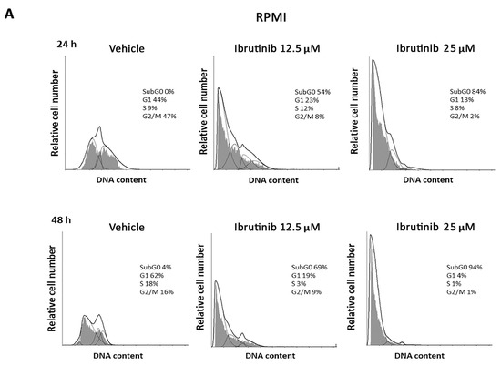 MM cell lines were incubated with Ibrutinib at concentration of 12.5 and 25 µM for 24 and 48 h. Cells were fixed in ice-cold 70% ethanol, treated for 30 min at 37 °C with 100 μg/mL ribonuclease A solution, stained for 30 min at room temperature with PI 20 μg/mL, and analysed by flow cytometry using linear amplification.