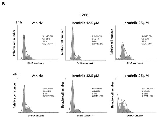 The effect of different doses of Ibrutinib on cell cycle progression was analysed in RPMI and U266 cells. Results showed that in RPMI cells BTK inhibitor arrests the cell cycle at G1 phase and accumulates cells at sub-G0 phase, just at 12.5 µM after 24 h with 94% of cells in sub-G0 phase observed at 25 µM after 48 h (Figure 2A). U266 cells were more resistant to the Ibrutinib effects. In this cell line, no changes were observed after 24 h at any Ibrutinib doses, and the maximal effect (35% of cells in sub-G0 phase) was detected at 25 µM dose after 48 h (Figure 2B). Overall, these data suggest that Ibrutinib induces DNA fragmentation and G1 arrest in both MM cells, with RPMI more sensitive and U266 cells more resistant to its effects.