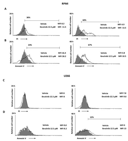 The capability of Ibrutinib at 12.5 µM to induce apoptotic cell death was evaluated. The results showed that Ibrutinib induces a PI positive signal in RPMI cell lines compared to vehicle-treated cells (Figure 3A); instead, no PI positive staining was evidenced in U266 cell lines (Figure 3C). Moreover, in order to evaluate a potential apoptotic cell death effect induced by Ibrutinib treatment, Annexin V staining was performed at the same condition tested for the PI assay. Annexin V positive signal was evident in RPMI cells (about 67%) (Figure 3B) and in U266 cell line (about 12%) (Figure 3D), suggesting that, although at different extension, both MM cell lines undergo apoptosis.