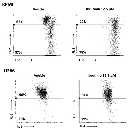 The effect of Ibrutinib on mitochondrial transmembrane potential (Δψm) was detected using JC-1 staining. After 48 h exposure to 12.5 µM Ibrutinib, RPMI cells showed a marked drop of Δψm compared to vehicle-treated cells (about 78 vs. 37%), whereas a lower effect compared to vehicle treated cells (about 19 vs. 10%) was evident in U266 (Figure 4). No changes in Δψm were evident in vehicle-treated cells compared to untreated cells (data not shown).