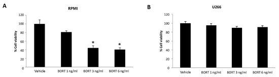 Cell viability assay in RPMI (A) and U266 (B) treated for 48 h with Bortezomib (BORT). Data are the mean ± SD of three different experiments. * p < 0.05 vs. vehicle-treated cells.