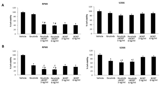 Cell viability assay in RPMI and U266 treated for 48 h with Bortezomib (BORT) in combination with Ibrutinib 5 µM (A) and 12.5 µM (B). Data are the mean ± SD of three different experiments. * p < 0.05 vs. vehicle, # p < 0.05 vs. Ibrutinib 12.5 µM, ç p < 0.05 vs. BORT.