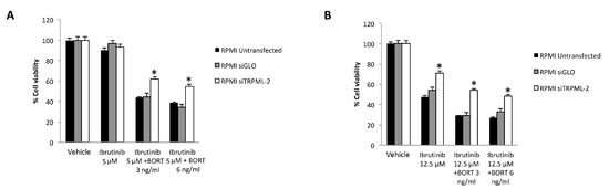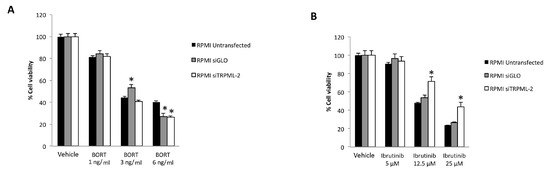 Finally, the silencing of TRPML2 in RPMI cells partially reverted the cytotoxic effect induced by Ibrutinib at 5 or 12.5 µM suboptimal dose in combination with Bortezomib at 3 or 6 ng/mL (Figure 9A,B).