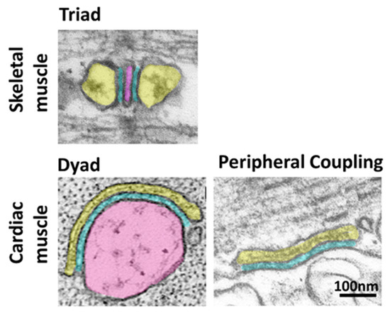 Organization of ER-PM junctions in skeletal and cardiac muscle. Thin section electron micrographs illustrating the different organization of ER-PM junctions in skeletal and cardiac muscle. The sarcoplasmic reticulum and the T-tubule are pseudo-colored in yellow and pink, respectively. The gap separating the T-tubule and the SR membrane is pseudo-colored in blue. The T-tubule is absent in cardiac peripheral couplings since the SR is juxtaposed to the plasma membrane at the periphery of the fiber. Images are from Perni et al. [4] (triad), Lavorato et al. [5] (dyad) and Perni et al. [6] (peripheral coupling).