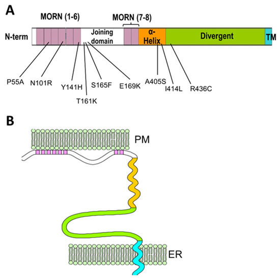 Schematic representation of junctophilin’s domain structure and its arrangement in the ER-PM junction. (A) Linear map showing the first (I through IV) and second (VII to VIII) set of MORN domains (in pink) separated by the joining domain (white). The α-helical domain (orange) follows MORN VIII and is separated from the transmembrane (TM, in cyan) by the long divergent domain (green). The numbers underneath the map indicate mutations associated with human cardiomyopathies identified in JPH2 and their relative positions. (B) Schematic representation of junctophilin’s organization in the ER-PM junctions (adapted from Garbino et al. [28]). The MORN motifs associated with the internal leaflet of the plasma membrane and the C-terminal transmembrane domain embedded in the endo/sarcoplasmic reticulum membrane allow junctophilins to bridge the two membrane systems together. Different domains are color-coded as indicated in (A).