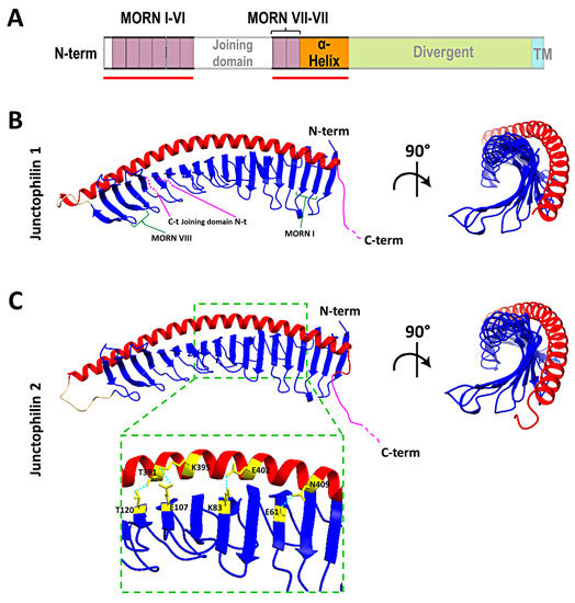 Structure of the MORNs and α-helical domains of human junctophilin1 and junctophilin2. (A) Schematic representation of junctophilin domain as shown in Figure 2; the solid red lines indicate the regions for which the structure is predicted with high fidelity by Alphafold2 and illustrated in (B,C). (B,C) predicted structures of the MORNs-α-helical domains of junctophilin1 (B) and junctophilin2 (C). The α-helical domain (in red) lies on the convex side of the MORN domains half-pipe structure (in blue) in both junctophilin1 and junctophilin2. β-sheet hairpins forming MORN domains I and VIII (green parentheses) and the position of the N-terminal end (N-t) and C-terminal end (C-t) of the joining domain (in pink), which is absent in this representation, are indicated in (B). The inset in (C) shows some of the residues that form the hydrogen bonds that stabilize the association between the MORN domains and the α-helical domain of junctophilin2.