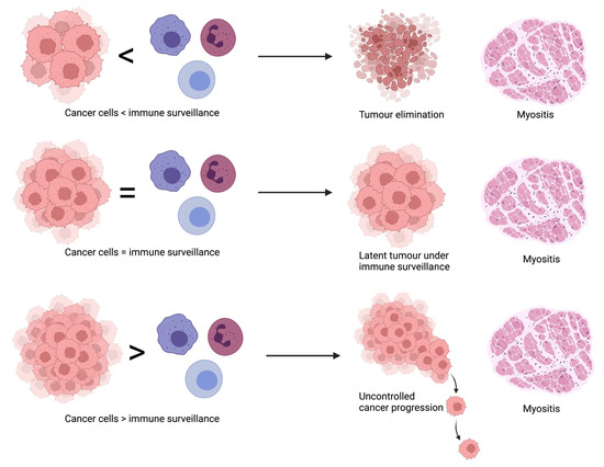 The above observations led to the formulation of an incredibly appealing theory that an outbreak of a fully symptomatic myositis may prove the temporal victory of immune surveillance over a developing tumor [19,35]. It is worth emphasizing that in the vast majority of patients with myositis, the disease is not accompanied by cancer, suggesting a highly efficient surveillance mechanism, which however carries a cost of myositis development as its side effect. Three possible courses of malignancy in myositis have been proposed—elimination, in which the immune system cease the growing tumor yet induces inflammatory myopathy; equilibrium, when in the patient with clinically apparent myositis tumor cells persist in latency under the surveillance of the immune system with a risk of progression if the control is lost; and escape, when a patient with myositis tumor overcomes the immune surveillance by, for example, LOH, preceding the uncontrolled expansion of the tumor [35]. A summary of the proposed theory has been presented in Figure 1.