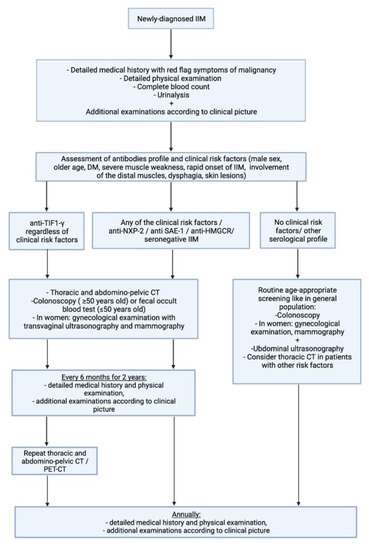 Although the association of IIM with cancer has been well-established for years, no clear guidelines have been published so far on the management of co-occurring malignancy. As versatile types of neoplasm can develop in patients with myositis, screening for latent malignancy should be comprehensive.