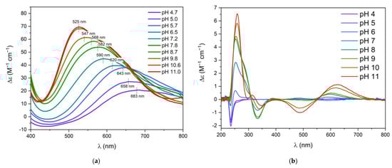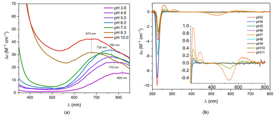 (a) Vis absorption spectra and (b) CD spectra of Cu2+ complexes with L2 at different pH values; M:L ratio 0.8:1. CM = 0.63 × 10−3 M, optical path 1 cm. The wavelength of maximum absorption is reported for each Vis absorption spectrum.