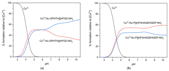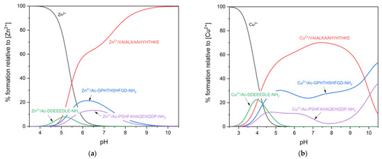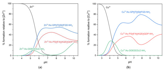 Supplementary information (SI) is available online at https://www.mdpi.com/article/10.3390/biom12010121/s1. Table S1: EPR parameters for Cu2+ complexes with the studied peptides at I = 0.1 M (KCl) and M:L molar ratio = 0.8:1, CL = 1.00 × 10−3 M (0.79 × 10−3 M for L3); Table S2: Stoichiometry, molecular formula and average m/z value for the species present in ESI-MS spectra of Cu2+ and Zn2+ complexes with the studied ligands, L:M molar ratio = 1:1 in water/methanol 50:50 solution; Figure S1: Species distribution diagram of Cu2+/Ac-GPHTHSHFGD-NH2, M:L ratio 0.8:1, CM = 0.79 × 10−3 M; Figure S2: Species distribution diagram of Cu2+/Ac-GPHTHAHFGD-NH2, M:L ratio 0.8:1, CM = 0.79 × 10−3 M; Figure S3: Species distribution diagram of Cu2+/Ac-PSHFAHAQEHQDP-NH2, M:L ratio 0.8:1, CM = 0.79 × 10−3 M; Figure S4: Species distribution diagram of Cu2+/Ac-PAHFAHAQEHQDP-NH2, M:L ratio 0.8:1, CM = 0.79 × 10−3 M; Figure S5: Species distribution diagram of Cu2+/Ac-DDEEEDLE-NH2, M:L ratio 0.8:1, CM = 0.79 × 10−3 M; Figure S6: (a) Vis absorption spectra and (b) CD spectra of Cu2+ complexes with L1_S6A at different pH values, M:L ratio 0.8:1, CM = 0.63 × 10−3 M, optical path 1 cm; Figure S7: (a) Vis absorption spectra and (b) CD spectra of Cu2+ complexes with L2_S2A at different pH values, M:L ratio 0.8:1, CM = 0.63 × 10−3 M, optical path 1 cm; Figure S8: Species distribution diagram of Zn2+/Ac-GPHTHSHFGD-NH2, M:L ratio 0.8:1, CM = 0.79 × 10−3 M; Figure S9: Species distribution diagram of Zn2+/Ac-GPHTHAHFGD-NH2, M:L ratio 0.8:1, CM = 0.79 × 10−3 M; Figure S10: Species distribution diagram of Zn2+/Ac-PSHFAHAQEHQDP-NH2, M:L ratio 0.8:1, CM = 0.79 × 10−3 M; Figure S11: Species distribution diagram of Zn2+/Ac-PAHFAHAQEHQDP-NH2, M:L ratio 0.8:1, CM = 0.79 × 10−3 M; Figure S12: Species distribution diagram of Zn2+/Ac-DDEEEDLE-NH2, M:L ratio 0.8:1, CM = 0.79 × 10−3 M; Figure S13: Competition plots for a solution containing equimolar concentrations (1 × 10−3 M) of Ac-GPHTHSHFGD-NH2, Ac-GPHTHAHFGD-NH2 and Zn2+; Figure S14: Competition plots for a solution containing equimolar concentrations (1 × 10−3 M) of Ac-PSHFAHAQEHQDP-NH2, Ac-PAHFAHAQEHQDP-NH2 and Zn2+; Figure S15: (a) ESI-MS spectrum for Cu2+/L1 system at L:M molar ratio=1:1 in MeOH:H2O (1:1) mixture solution, (b) comparison of experimental and simulated isotopic pattern of the chosen metal complex [CuH2L]3+; Figure S16: (a) ESI-MS spectrum for Zn2+/L1 system at L:M molar ratio=1:1 in MeOH:H2O (1:1) mixture solution, (b) comparison of experimental and simulated isotopic pattern of the chosen metal complex [ZnH2L]3+; Figure S17: (a) ESI-MS spectrum for Cu2+/L2 system at L:M molar ratio=1:1 in MeOH:H2O (1:1) mixture solution, (b) comparison of experimental and simulated isotopic pattern of the chosen metal complex [CuH3L]3+.