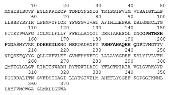 Amino acid sequence of Zrt2 from C. albicans [9]. The investigated zinc (and copper) putative binding sites are highlighted in bold.