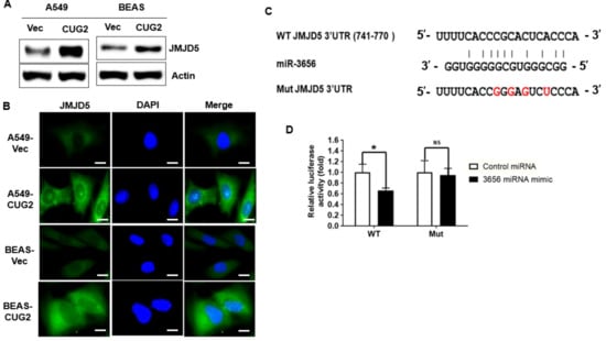 CUG2 downregulates miR-3656, which targets the JMJD5 transcript. (A,B) JMJD5 protein levels in A549-CUG2, BEAS-CUG2, and control cells were measured using immunoblotting assay and under immunofluorescence microscopy. Assays were repeated twice. Scale bar indicates 10 μm. 4,6-diamidino-2-phenylindole (DAPI) was used to stain the nucleus; (C) Predicted miR-3656 target sequences in JMJD5 3′UTR and mutated nucleotide sequence of JMJD5 3′UTR (D) HEK293A cells were transfected with the miR-3656 mimic and luciferase reporter vectors containing either the WT or mutant nucleotide sequence of JMJD5 3′UTR. The assay was conducted in triplicate, and error bars indicate the SD. (* p < 0.05; miR-3656 vs. miR-control in WT 3′UTR of JMJD5). NS, not significant.