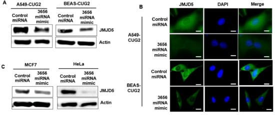 Administration of miR-3656 mimic decreased JMJD5 expression protein under CUG2 overexpression. (A,B) JMJD5 protein levels in A549-CUG2 and BEAS-CUG2 cells were measured using immunoblotting and immunofluorescence at 2 days post-transfection with the miR-3656 mimic or control miRNA. Scale bar indicates 10 μm. Assays were repeated twice; (C) JMJD5 protein levels in HeLa and MCF7 cells were measured by immunoblotting at 2 days post-transfection with the miR-3656 mimic or control miRNA.