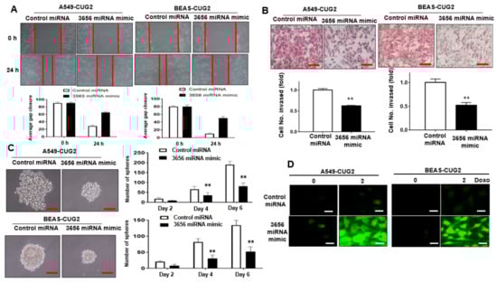 Treatment with miR-3656 mimic diminished CUG2-induced CSC-like phenotypes. (A) Migration of A549-CUG2 and BEAS-CUG2 cells treated with the miR-3656 mimic or miR-control was measured in a wound healing assay; (B) Cell invasion by A549-CUG2 and BEAS-CUG2 cells treated with the miR-3656 mimic or miR-control was measured in a transwell invasion assay. The assay was performed in triplicate, and the error bars indicate the SD. Scale bar indicates 10 μm. (** p < 0.01, miR-3656 mimic vs. miR-control); (C) A549-CUG2 and BEAS-CUG2 cells were treated with the miR-3656 mimic or miR-control. Spheroid size and number were evaluated for 6 days post-seeding. Spheroid size >50 mm was the criterion for sphere formation. The assay was conducted in triplicate, and the error bars indicate the SD. Scale bar indicates 10 μm. (** p < 0.01, miR-3656 mimic vs. miR-control); (D) Doxorubicin was treated for 12 h after transfection of A549-CUG2 and BEAS-CUG2 cells with the miR-3656 mimic or miR-control. ROS were detected in the cells under a fluorescence microscope using 2,7-dichlorodihydrofluorescein diacetate (20 μM). Scale bar indicates 10 μm.