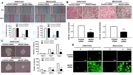 Administration of JMJD5 siRNA hampered CSC-like phenotypes under CUG2 overexpression. (A) Cell migration from A549-CUG2 and BEAS-CUG2 cells treated with JMJD5 siRNA or control siRNA was measured in a wound healing assay; (B) Cell invasion from A549-CUG2 and BEAS-CUG2 cells treated with JMJD5 siRNA or control siRNA was measured in a transwell invasion assay. The assay was performed in triplicate, and error bars indicate the SD (**p < 0.01, JMJD5 siRNA vs. control siRNA); (C) A549-CUG2 and BEAS-CUG2 cells were treated with JMJD5 siRNA or control siRNA. Spheroid size and number were evaluated for 6 days post-seeding. A spheroid size >50 mm was the criterion for sphere formation. The assay was conducted in triplicate, and error bars indicate the SD (** p < 0.01, miR-3656 mimic vs. miR-control); (D) Doxorubicin was treated for 12 h after transfection of A549-CUG2 and BEAS-CUG2 cells with JMJD5 siRNA or control siRNA. ROS were detected in the cells under a fluorescence microscope using 2,7-dichlorodihydrofluorescein diacetate (20 μM). Scale bar indicates 10 μm.