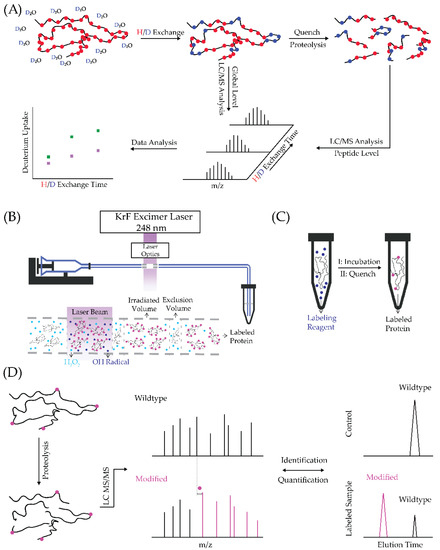 Schematic illustration of footprinting and bottom-up analysis workflow. (A) HDX: red dots represent protein backbone hydrogens; the green and purple squares in the deuterium uptake plot represent two different protein states. (B) FPOP: the laser window is shown as a grey dash line in the flow system; the zoom-in view of the laser window is shown below the flow set-up. (C) Specific amino-acid labeling. (D) Bottom-up analysis.