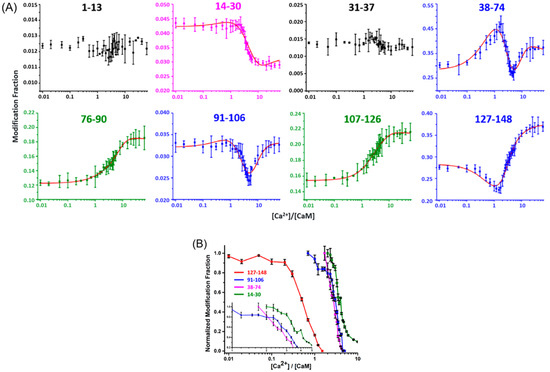 Liu et al. [132] investigated the binding between Ca2+ and calmodulin by LITPOMS. In their study, 1 μM calmodulin was titrated with increasing concentrations of Ca2+, ranging from 0 to 60 equiv. The tryptic peptide-level modification fractions were determined, and their behaviors grouped into four categories (Figure 4A). Peptides 76–90 and 107–126, representing Class I behavior, exhibited increased modification, whereas that of Class II, reflected by peptides 1–13 and 31–37, remained relatively constant throughout the titration. Increased protection occurred for peptide 14–30, comprising Class III behavior. Class IV behavior, consisting of peptides 38–74, 91–106 and 127–148, was composite, owing to a combination of binding and conformational changes.