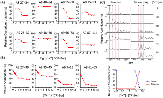 The investigators also extracted the binding order of Ca2+ with the four EF hands by comparing the onsets for increased protection. In other words, preferential Ca2+ binding causes its EF hand to show decreased modification at lower metal-to-protein ratios. The binding orders are EF hand 4 (127–148) > EF hand 3 (91–106) > EF hand 2 (37–74) > EF hand 1 (14–30) (Figure 4B). The investigators further fitted the peptide-level modification fraction curves for each EF hand and calculated the binding affinities for EF hands from 1 to 4 to be 2.9 × 106 M−1, 4.1 × 104 M−1, 6.2 × 106 M−1 and 1.4 × 106 M−1, respectively. The success of fitting was demonstrated by the reasonable agreement with the literature binding affinities [130].
