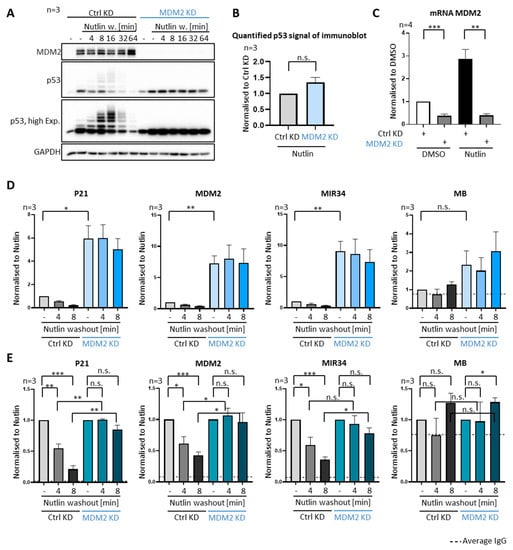 Requirement of MDM2 for removing p53 from promoters. (A–E) The Nutlin washout experiment was preceded by the depletion of MDM2 using siRNA transfection for 48 h, or by transfection of a scrambled negative control siRNA. (A) Knockdown (KD) of MDM2 largely abolished p53 ubiquitination and decelerated its degradation. (B) Quantification of the signal corresponding to p53 upon Nutlin treatment and either control KD or MDM2 KD in three biological replicates of immunoblot analyses, as shown in (A), lanes 2 and 8. Upon Nutlin treatment, p53 levels are hardly rising in cells transfected with siRNA to MDM2. (C) mRNA of MDM2 was measured by qPCR to confirm the depletion of MDM2 by siRNA transfection. (D) ChIP with anti-p53 antibodies after MDM2 depletion and Nutlin washout. P53 occupancy at its target genes P21, MDM2, MIR34 and MB (negative control) revealed increased p53 occupancy upon MDM2 depletion, and diminished removal of p53 upon Nutlin washout. Three biological replicates were normalized to chromatin input and then to the control transfected Nutlin sample (sample 1; without washout) and shown as mean + SEM. MDM2 depletion strongly increased the association of p53 with promoter DNA. (E) The same data as in (D) are now displayed with both Nutlin samples (samples 1 and 4; each prior to washout), regardless of the siRNA, set to 1 and used as normalization references for each siRNA species. This normalization allows a better comparison of both Nutlin washouts regarding their impact on the relative loss of p53 on promoters. Knockdown of MDM2 increased the stable association of p53 with its cognate promoter elements. *** p < 0.001; ** p < 0.01; * p < 0.05; n.s., non-significant. “-“, no Nutlin washout.