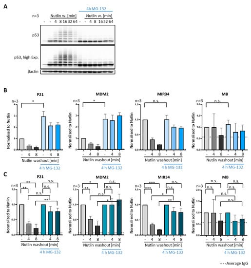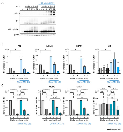 Removal of p53 from promoters independent of proteasome activity. (A–C) To inhibit the proteasome for a brief period, SJSA cells were treated with the pharmacological proteasome inhibitor 20 µM MG-132, or DMSO alone, for 20 min prior to Nutlin washout. Proteasome inhibition was continued after Nutlin was removed. (A) The delayed degradation of p53 as well as the accumulation of ubiquitinated p53 upon proteasome inhibition is visible in representative immunoblots. HIF-1α, a protein with particularly high turnover [22], was detected to control proteasome inhibition. (B) A brief pulse of MG-132 increases the amount of DNA-bound p53 but does not compromise p53-removal from promoters upon Nutlin washout, as revealed by ChIP analysis. Three biological replicates, mean + SEM. (C) The same data as in (B) but normalized as described for Figure 3E, visualizing comparable removal of p53 from its cognate promoters regardless of short proteasome inhibition. *** p < 0.001; ** p < 0.01; * p < 0.05; n.s., non-significant. “-“, no Nutlin washout.