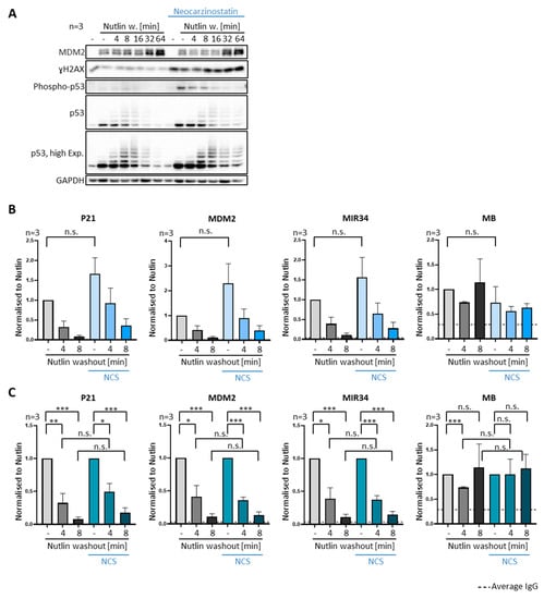 Removal of p53 regardless of DNA damage signaling. (A–C) SJSA cells were treated with 250 ng/mL of neocarzinostatin (NCS), a drug that induces double-strand breaks (DSBs) in cellular DNA. Treatment was started 2 h prior to Nutlin washout and was continued after Nutlin was removed. (A) Immunoblot analysis revealed the expected increase in the DNA damage marker γH2AX and enhanced phosphorylated p53 at Serin 20. (B) The association of p53 with chromatin in SJSA cells was investigated by ChIP. P53 dissociated from its cognate promoters upon Nutlin washout regardless of NCS treatment. (C) Data as in (B) but normalized as described in Figure 3E. *** p < 0.001; ** p < 0.01; * p < 0.05; n.s., non-significant. “-“, no Nutlin washout.