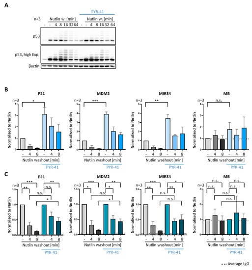 Attenuated p53-removal upon E1 ligase inhibition. (A–C) Ubiquitination was inhibited by adding 20 µM of the E1 ubiquitin activating enzyme inhibitor PYR-41 for 4 h prior to Nutlin washout, with continued treatment after Nutlin removal. (A) Immunoblot analysis revealed that p53 ubiquitination and degradation after Nutlin washout is reduced by PYR-41, albeit to a lesser extent than upon prolonged proteasome inhibition (Figure 6A). (B) P53 occupancy on promoter DNA, detected by ChIP analysis, was significantly increased upon treatment with PYR-41. The velocity of p53 removal, however, was reduced by PYR-41, as further visualized in (C). *** p < 0.001; ** p < 0.01; * p < 0.05; n.s., non-significant. “-“, no Nutlin washout.