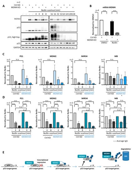 Efficient removal of p53 from promoters upon depletion of MDM4. (A–D) SJSA cells were transfected with siRNA against MDM4 48 h prior to Nutlin washout, or control transfected. (A) Depletion of MDM4 leads to the reduced ubiquitination of p53 and increased induction of p21 as visible by the analysis of a representative immunoblot. (B) Measurement of MDM4 mRNA shows an efficient MDM4 depletion by siRNA treatment. (C) ChIP analysis upon Nutlin washout, with or without MDM4 depletion. (D) The dissociation of p53 from promoters upon Nutlin washout was still significant and did not grossly differ regardless of MDM4 depletion. (E) Graphical summary of the proposed mechanism of MDM2-dependent p53 removal from cognate promoter sites. MDM2 associates with p53 and inhibits its transcriptional activity. MDM2-dependent ubiquitination of p53 is a necessary prerequisite for p53 removal from its target genes. Subsequently, the MDM2–MDM4 complex polyubiquitinates p53, followed by its proteasomal degradation. *** p < 0.001; ** p < 0.01; * p < 0.05; n.s., non-significant. “-“, no Nutlin washout.