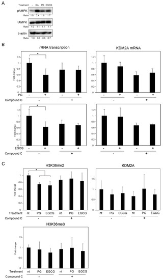 PG- and EGCG-mediated activation of AMPK is required for the decrease in the levels of histone H3K36me2 in the rRNA gene promoter and consequent rRNA transcription. (A) MCF-7 cells were treated with 50 μM GA, PG, or EGCG for 4 h. The cells were then lysed, and the levels of phosphorylated-AMPKα (Thr172) (pAMPK), total AMPKα (tAMPK), and β-actin were analyzed via immunoblotting. (B) MCF-7 cells were treated with (+) or without (-) 50 μM PG or EGCG in the presence (+) or absence (-) of 10 μM compound C, an AMPK inhibitor, for 4 h. Total RNA was extracted, and the levels of rRNA transcripts (pre-rRNA) (left panel) and KDM2A mRNA (right panel) were determined using qRT-PCR. The results are shown as the fold change in relation to cells in the absence of compounds. (C) MCF-7 cells were treated with or without 50 μM PG or EGCG in the presence (+) or absence (-) of 10 μM compound C for 4 h. The levels of H3K36me2, H3K36me3, and KDM2A in the rRNA gene promoter were analyzed by ChIP assay. The results are shown as the fold change in relation to cells in the absence of compounds. The experiments in (B,C) were performed more than three times, and the mean values with standard deviations are shown. * p < 0.05.