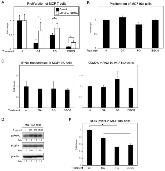 Impact of PG and EGCG on the proliferation of MCF-7 and MCF10A cells. (A) MCF-7 cells transfected with control siRNA or KDM2A siRNA were treated with 50 μM GA, PG or EGCG for 2 days. Cell proliferation was analyzed using the CyQUANT® direct cell proliferation assay. The results are shown as the fold change in relation to cells treated with siRNA in the absence of compounds. (B) MCF10A cells were treated with 50 μM GA, PG, or EGCG for 2 days. Cell proliferation was analyzed, as in (A). The results are shown as the fold change in relation to cells in the absence of compounds. (C) MCF10A cells were treated with 50 μM GA, PG, or EGCG for 4 h. Total RNA was extracted, and the levels of rRNA transcripts (pre-rRNA) (left panel) and KDM2A mRNA (right panel) were determined using qRT-PCR. The results are shown as the fold change in relation to cells in the absence of compounds. (D) MCF10A cells were treated with 50 μM GA, PG, or EGCG for 4 h. The cells were then lysed and the levels of phosphorylated-AMPKα (Thr172) (pAMPK), total AMPKα (tAMPK), and β-actin were analyzed via immunoblotting. (E) MCF10A cells were treated with 50 μM GA, PG, or EGCG and cultured for 4 h in the presence of DCFDA, a cell-permeable ROS probe. Fluorescence was measured and the signal intensity was normalized to that of blank condition (no cells) without treatments. The results are presented as the fold change from cells without treatment. All experiments were performed more than three times, and the mean values with standard deviations are shown. * p < 0.05.