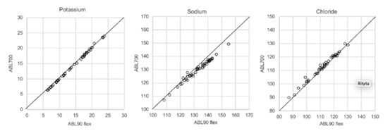 The blood gas instruments used for this study were ABL700, ABL835 and ABL90 flex (all from Radiometer Copenhagen, Brønshøj, Denmark). Each of these instruments is able to determine levels of Na+, Cl−, K+, Ca++, glucose, lactate, pH, pCO2, pO2, total Hb and specific forms of Hb (i.e., COHb, MetHb, O2Hb, HHb, HbF and SHb). For this project, the concentrations of potassium, sodium, chloride and glucose were measured. The analysis of these parameters was performed by sensor units with selective permeable membranes. The sensor units employ two different measuring principles, potentiometry for electrolytes and amperometry for glucose and lactate. For electrolyte measurements, the sensing element is an ion-selective sensor with a membrane with a specific ion carrier (potassium and chloride) or an ion-selective ceramic pin (sodium). The concentration of glucose was measured using an amperometric method. The sensor has a silver cathode and a platinum anode in contact with an electrolyte solution.