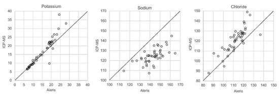 In Figure 1, Figure 2, Figure 3 and Figure 4 the results obtained with the ABL90 flex and other instruments are shown. Almost identical results were obtained with the ABL 90 flex and ABL700 (Figure 1). Analysis with a Beckman Coulter AU5800 showed significantly (p < 0.001) higher sodium concentrations (Figure 2), but very similar potassium and chloride concentrations. ICP-MS analysis showed consistently lower sodium concentrations compared with the ABL 700 (p = 0.002), ABL90 flex (p < 0.001) and Beckman Coulter AU5800 (p < 0.001) and also higher chloride concentrations than the ABL90 flex (p < 0.019) and Beckman Coulter AU5800 (p = 0.007) (Figure 3 and Figure 4). Up to about 20 mmol/L, the ICP-MS showed similar potassium concentrations as the ABL 90 flex and Beckman Coulter AU5800, but showed an upward deviation at higher potassium levels.