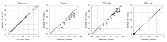 Figure 5 shows undiluted vitreous samples compared with samples that were diluted 1:2 with distilled water. Dilution seems to have no impact on potassium or glucose, whereas sodium and chloride show slightly lower values than expected when diluted. Please note that the diluted concentrations for sodium and chloride are below the calibration range of the ABL700 instrument.